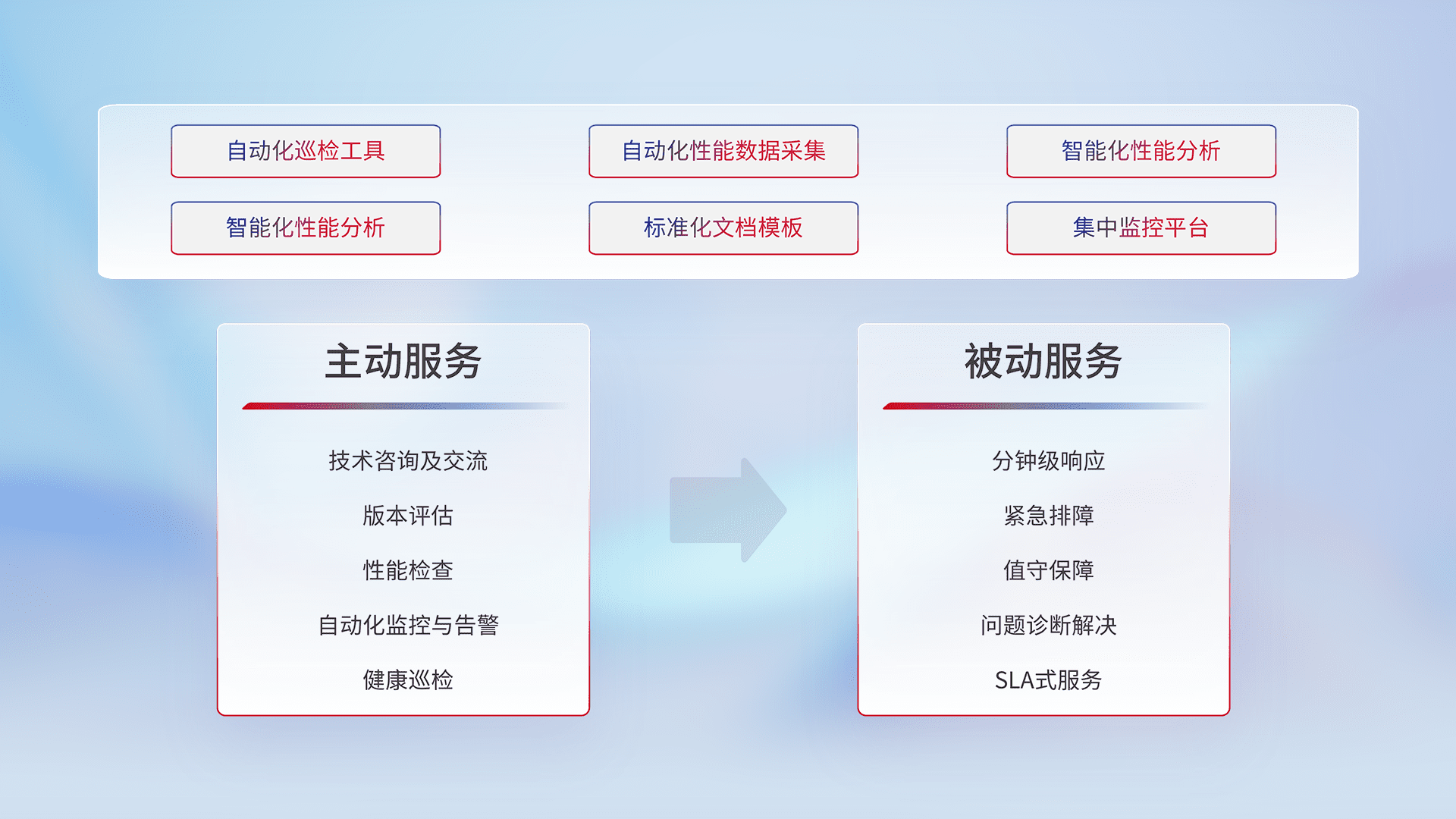 智能化工具和标准化文档,,保障服务质量,,提供主动服务(包含技术咨询、、、、版本评估、、、性能检查、、、、自动化监控与告警、、健康巡检)和被动服务包含(分钟级响应、、紧急排障、、值守保障、、、、问题诊断解决、、、、SLA服务)。。。。