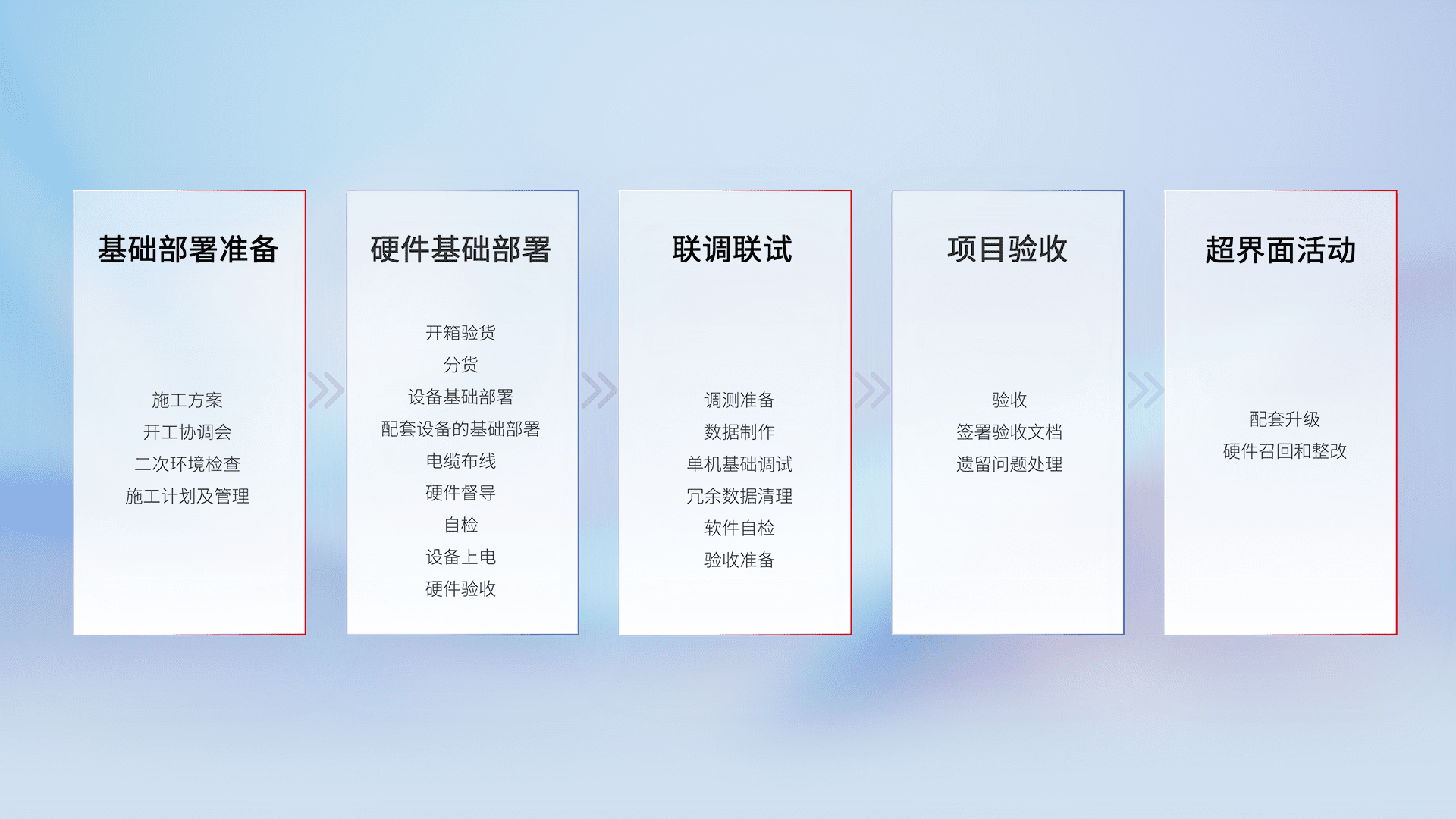 从基础部署准备、、、、硬件基础部署、、、、联调联试、、项目验收、、、、越界面活动的全过程可追溯,,,保证施工质量和进度。。。。